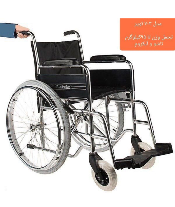 ویلچر تاشوی مدل ۷۰۳ از برند ایران بهکار با تحمل وزن تا ۹۵ کیلوگرم، گزینهای مناسب برای جابجایی افراد توانیاب در محیطهای داخلی و خارجی است. این ویلچر با وزن ۱۹ کیلوگرم طراحی شده تا حمل و نقل آن راحت باشد. دستگیرهها و جاپاییها در این مدل ثابت هستند، اما امکان تنظیم ارتفاع جاپایی در چهار سطح مختلف وجود دارد. بدنه فلزی با پوشش رنگی این ویلچر مقاومت بالایی در برابر زنگزدگی دارد. همچنین، نشیمن و پشتی از پارچه برزنتی با دوام ساخته شدهاند. بهعلاوه، این ویلچر در حالت تاشده فضای کمی اشغال میکند و به راحتی در صندوق عقب بیشتر خودروها جای میگیرد.